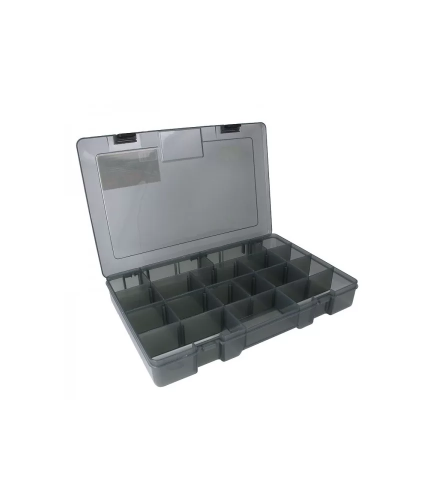 Plastikinė dėžutė dirbtiniams žvejybos masalams, priedams laikyti. Pagaminta iš stiprios skaidrios medžiagos. Jame yra keturi pailgi skyriai, kurių kiekvienas yra 4,5 cm pločio ir 35 cm ilgio. Jame yra 12 nuimamų skirstytuvų, kuriuos galima naudoti skirtingose skyrelių pozicijose. Dėžutės žvejybos smulkmenoms dangtis turi du tvirtus vyrius ir stabilų dvigubą sutvirtinimą. Tinka laikyti smulkiems aksesuarams ar dirbtiniams masalams: vobleriams, blizgėms ir džigams.