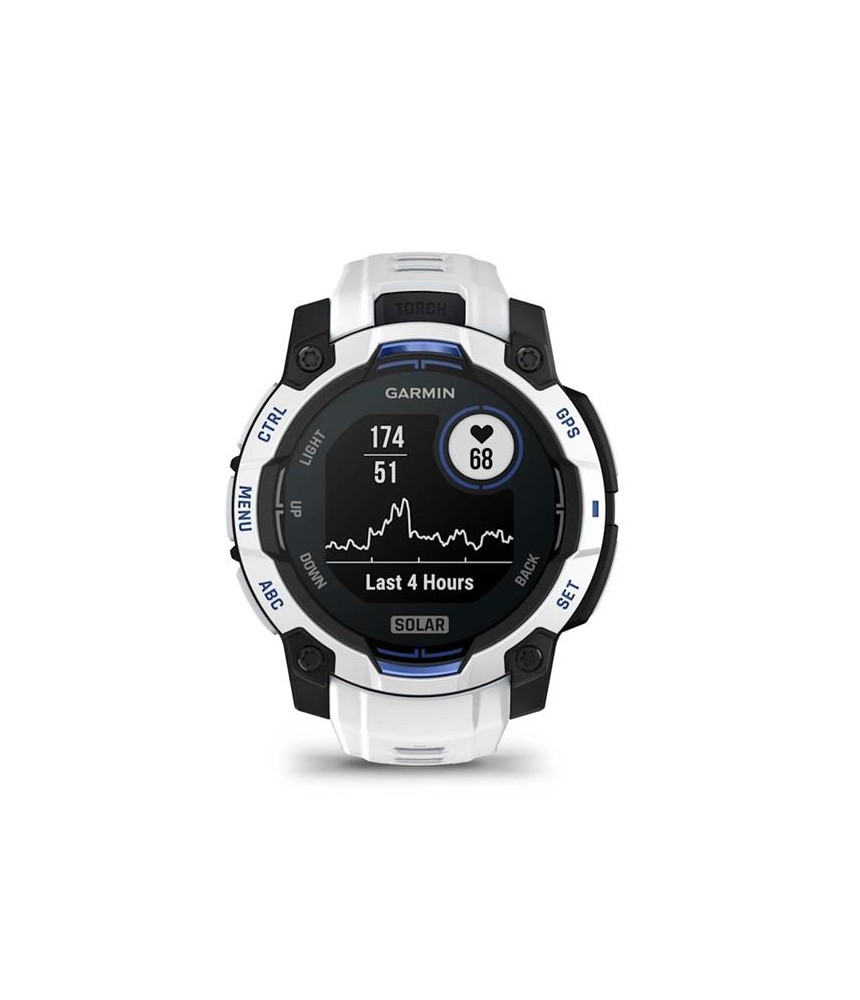 Instinct 3 – 45 mm Solar Supernova collection Whitestone and bolt blue silicone band