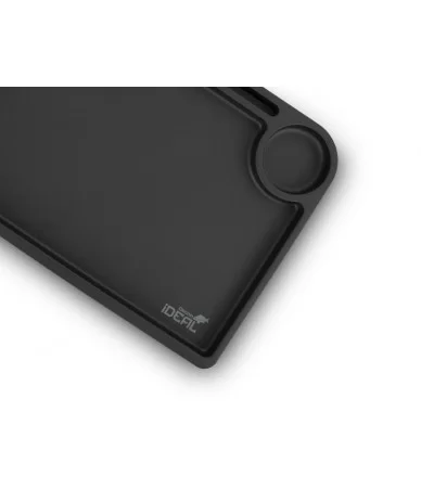 Stalviršis pagamintas iš tvirto plastiko ir turi pakeltą 2 cm aukščio kraštą, kuris saugo smulkius daiktus nuo iškritimo. Viršuje taip pat įrengta siaura skyrelio tipo zona, skirta smulkiems aksesuarams ar jau paruoštiems pavadėliams – viskas po ranka, kai to labiausiai reikia. Be to, stalas turi atskirą apvalų paviršių gėrimui – puikiai tinka tiek termopuodeliui, tiek stiklinei.