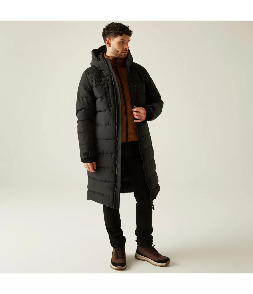 Pagaminta iš lengvo, bet patvaraus poliesterio, ši ilgo kirpimo vyriška striukė suteikia maksimalią šilumą be nereikalingo svorio. Jos viduje – aukščiausios kokybės perdirbtas sintetinis pūkas, kuris ne tik efektyviai saugo nuo šalčio, bet ir yra draugiškas aplinkai. Vandeniui atspari danga saugo nuo lietaus ir šlapdribos, o nuimamas gobtuvas su reguliatoriais bei vidiniai audros rankogaliai – nuo žvarbaus vėjo.