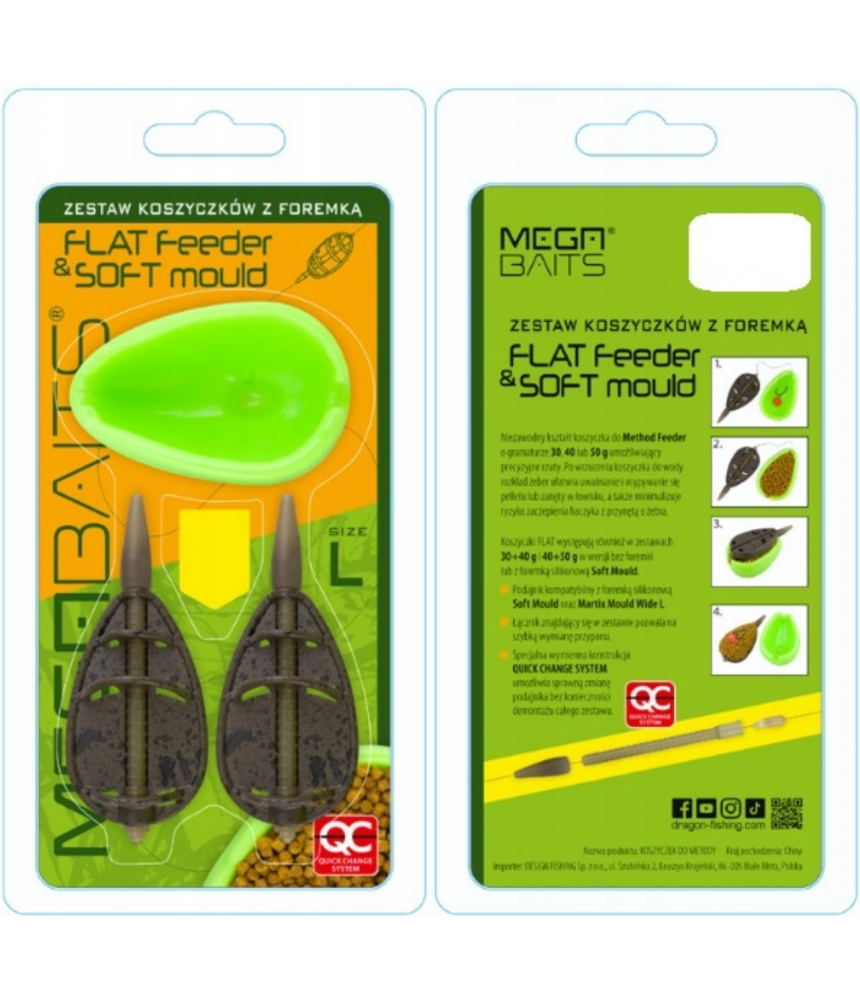 Šis 40 g ir 50 g FLAT tipo šėryklėlių rinkinys su Soft Mold silikonine forma – puikus pasirinkimas žvejojant didesniu atstumu ar stipresnėje srovėje. Tvirta konstrukcija ir optimaliai išdėstytos briaunos padeda tolygiai paskirstyti jauką vandenyje bei sumažina kabliuko užstrigimo riziką.