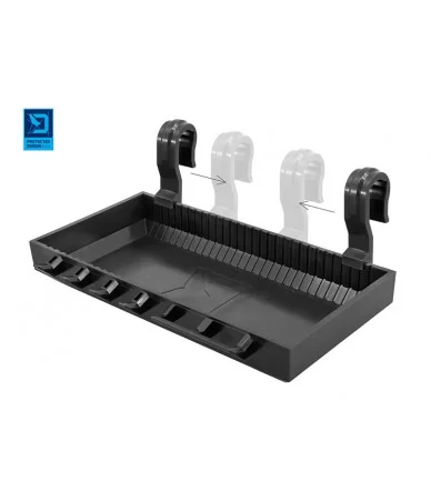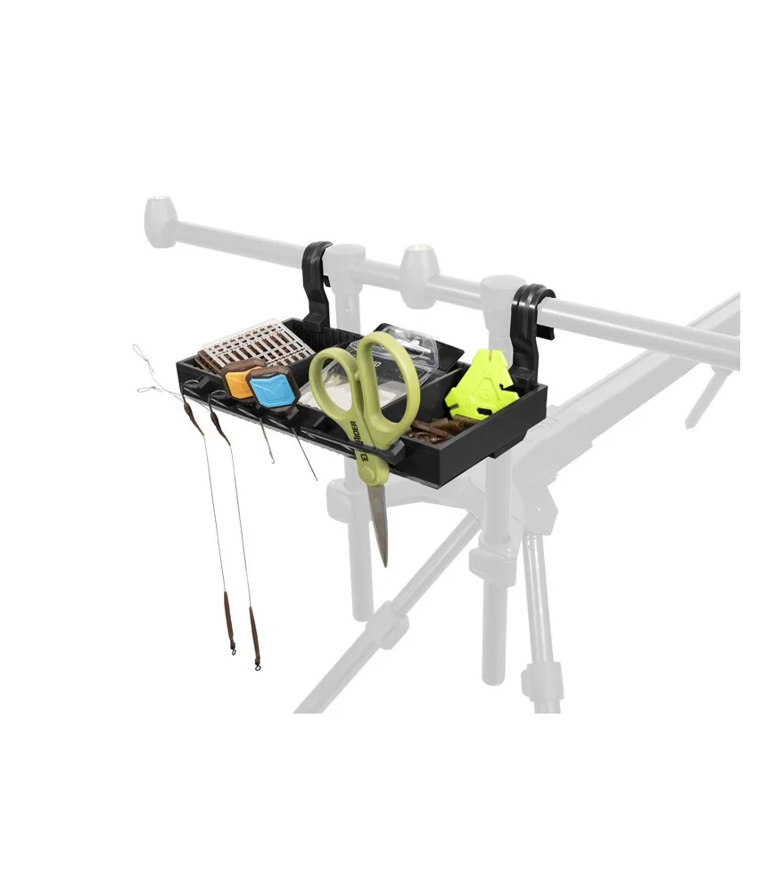 Du tvirti plastikiniai kabliai leidžia greitai ir paprastai pakabinti lentynėlę ant laikiklio. Kadangi kabliai yra nuimami, lentynėlę galima lengvai perkelti į bivį, ant stalo ar kitą patogią vietą.