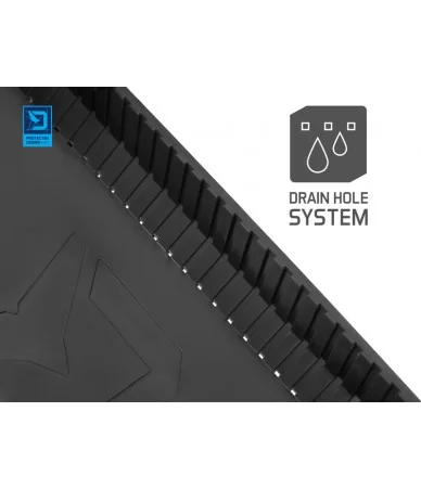 Lentynėlė turi pakeltus kraštus, kurie apsaugo įrangą nuo iškritimo. Dugne esantys perforuoti skylučių tarpai leidžia nutekėti vandeniui lietaus metu, todėl priedai neliks šlapi.